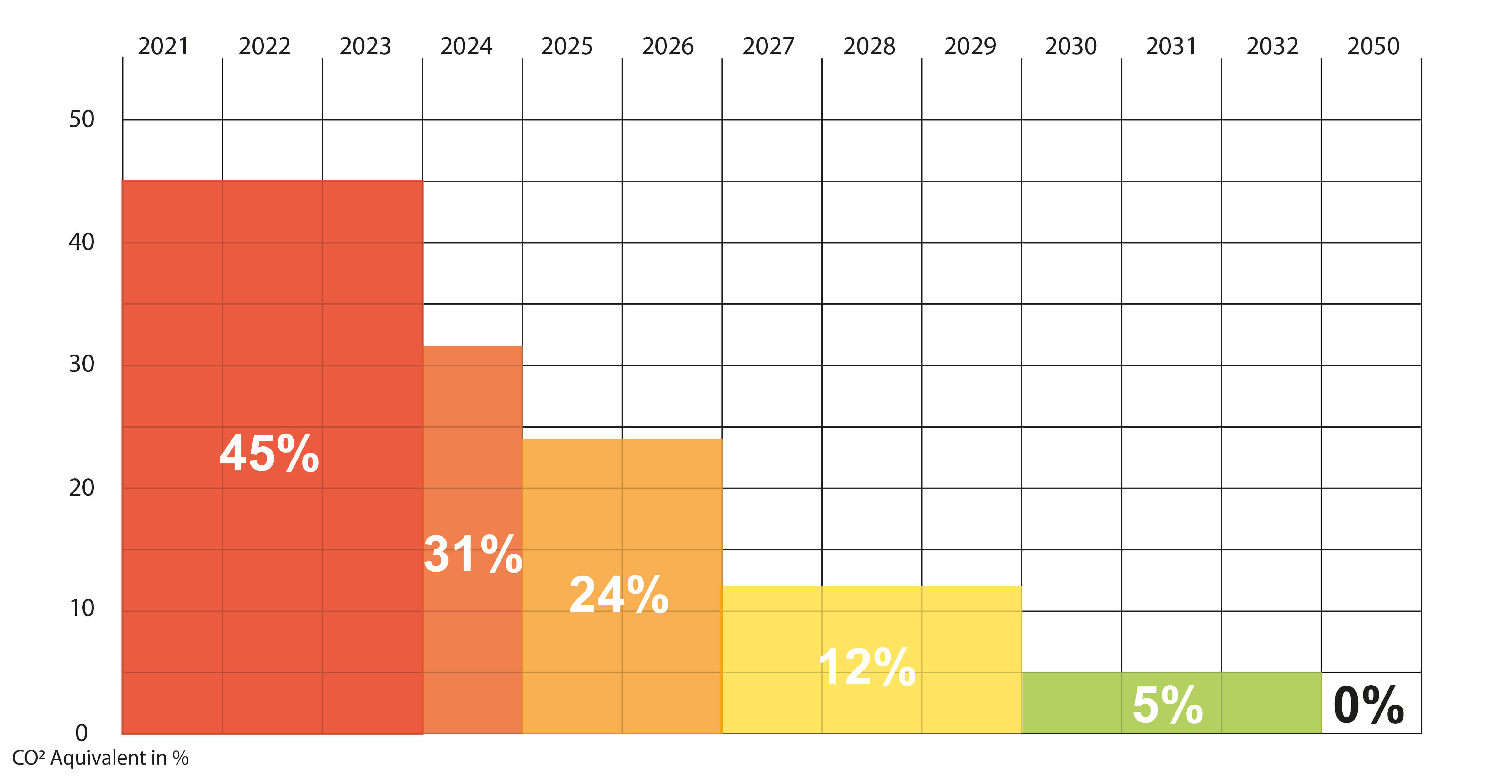 Phase-down → Phase-out: Die am Markt verfügbaren Mengen an HFKW werden schrittweise reduziert, bis ein vollständiger Ausstieg im Jahr 2050 erreicht ist.